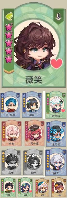 角色之间都会有缘分,就是类似羁绊的东西,同一星级就能升级,萌新的话都推荐弄美男子和攻速四姐妹这两个前期都是很好的缘分,能够补足攻击觉醒和攻速觉醒的乘区。