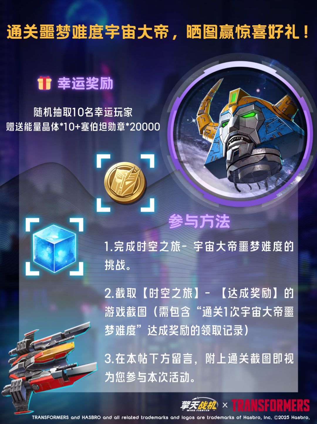 我们将从所有参与的玩家中随机抽取10名幸运玩家,赠送能量晶体*10+塞伯坦勋章*20000