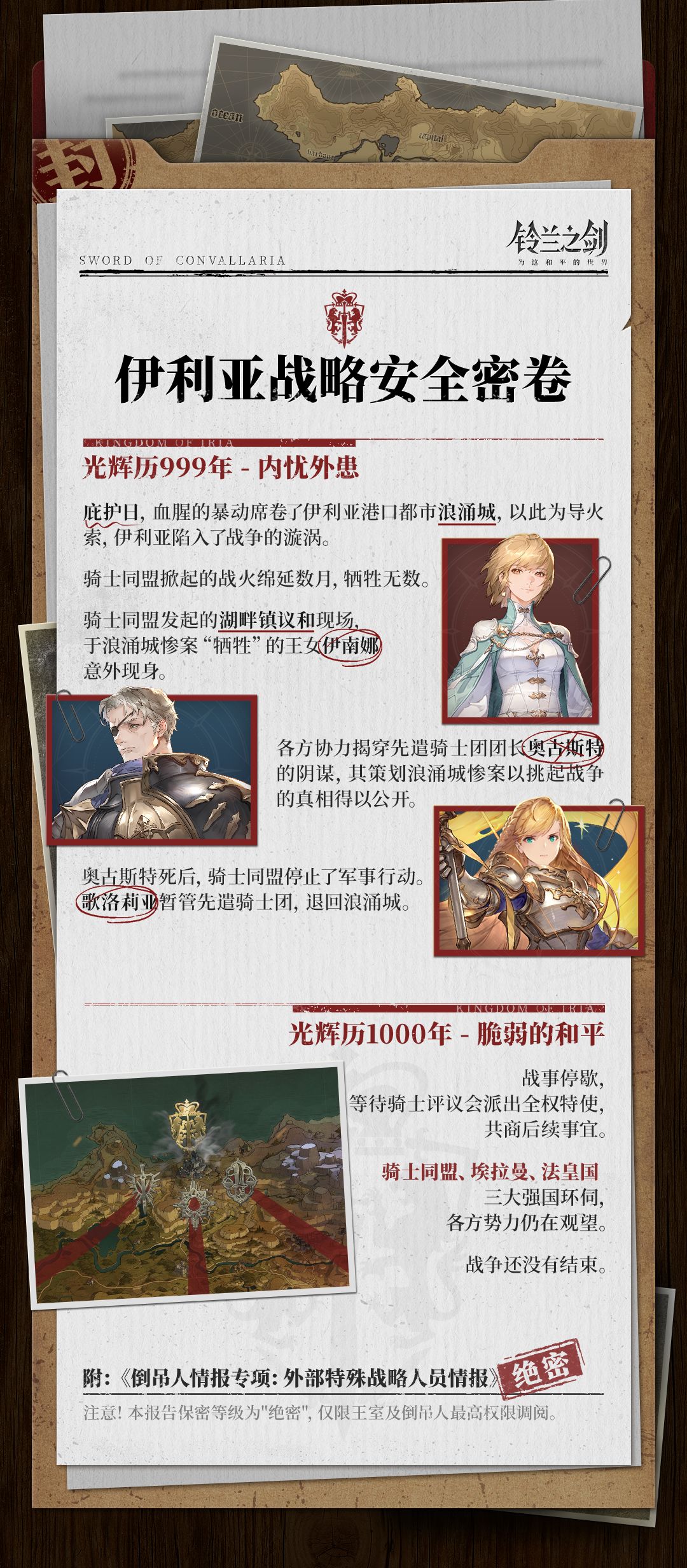 光辉历999年至光辉历1000年,伊利亚在持续抗争后获得了脆弱的和平,然而骑士同盟、埃拉曼、法皇国强国环伺,各方势力仍在观望。