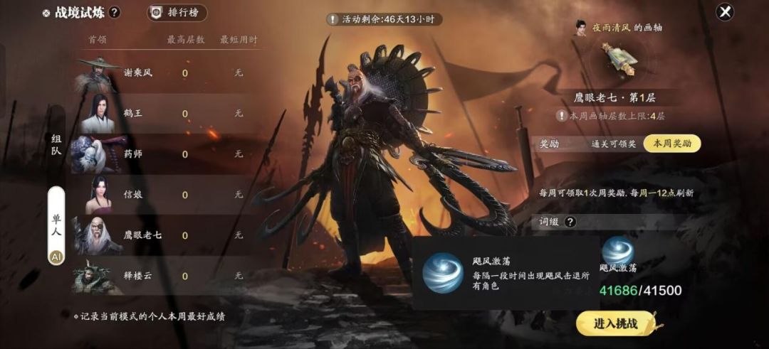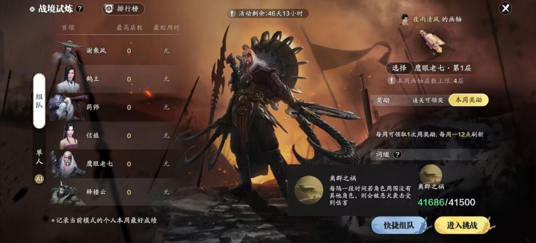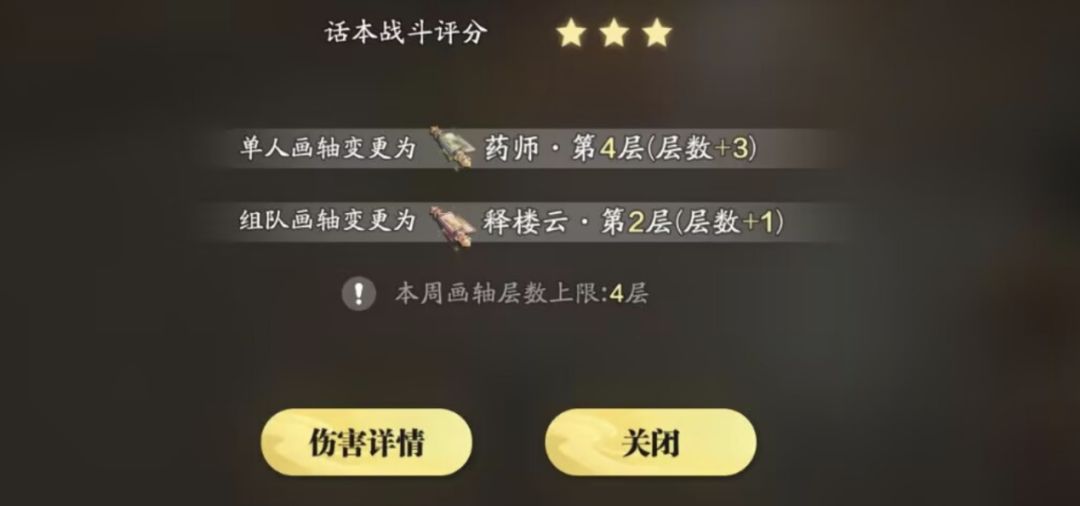 - 每周可根据历史已通关层数获得画轴,单人模式下只能使用自身画轴 - 组队模式中队长可选择任一队员画轴进行挑战 3.评分与层数提升