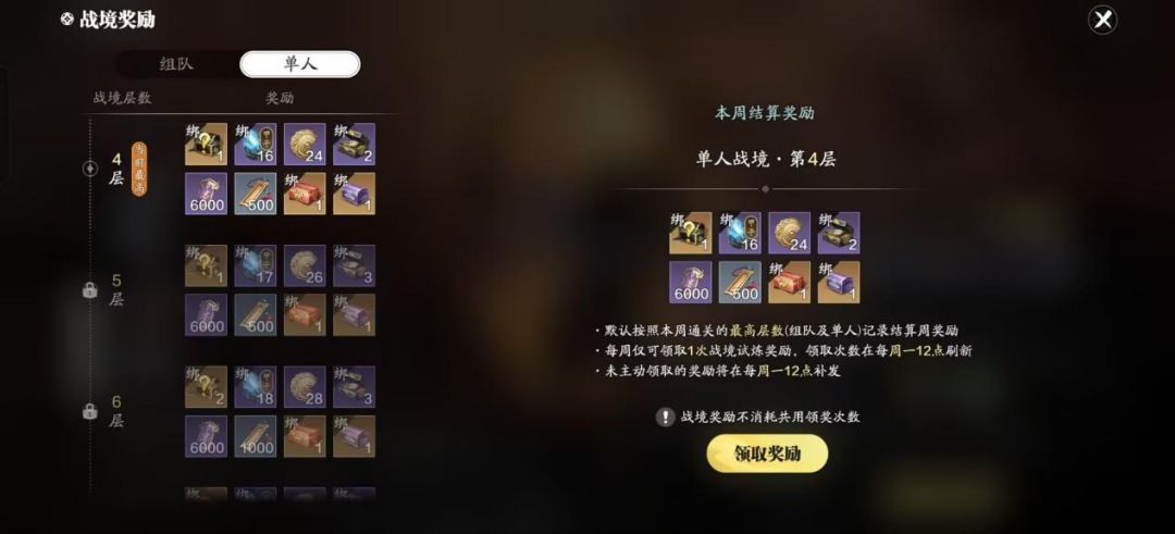 - 每周可领取一次周奖励,按本周最高通关层数结算 - 组队模式奖励优于单人模式 - 领取次数刷新时间和奖励补发时间是每周一12点 每周最高层数结算奖励包括:琳琅珍奇礼盒、赛季定数珍稀礼盒、绝品璞玉匣等稀有道具。5.排行榜结算