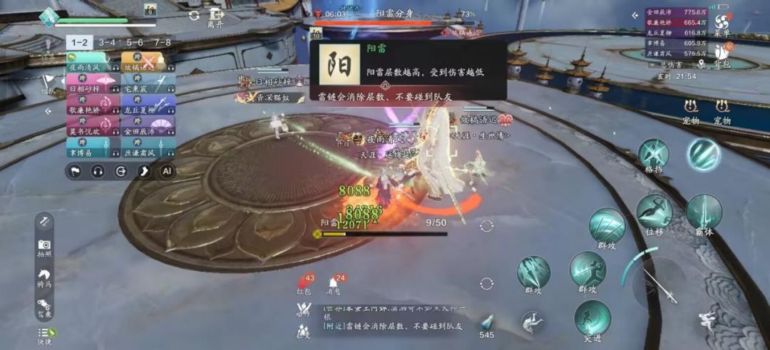 因为分身剩余气血一旦相差超过 15%,则气血多的分身会立即对另一方进行治疗,回复 10% 气血。需在 60 秒内将两边分身打到 60% 血量左右,此时所有人停手,只留一个队员慢慢磨伤害,等待分身技能。60 秒一到,分身会跳回平台中心,阳雷分身释放【太阳雷盾】,给自己增加护盾;阴雷分身会点名 4 位少侠释放【极阴雷击】。