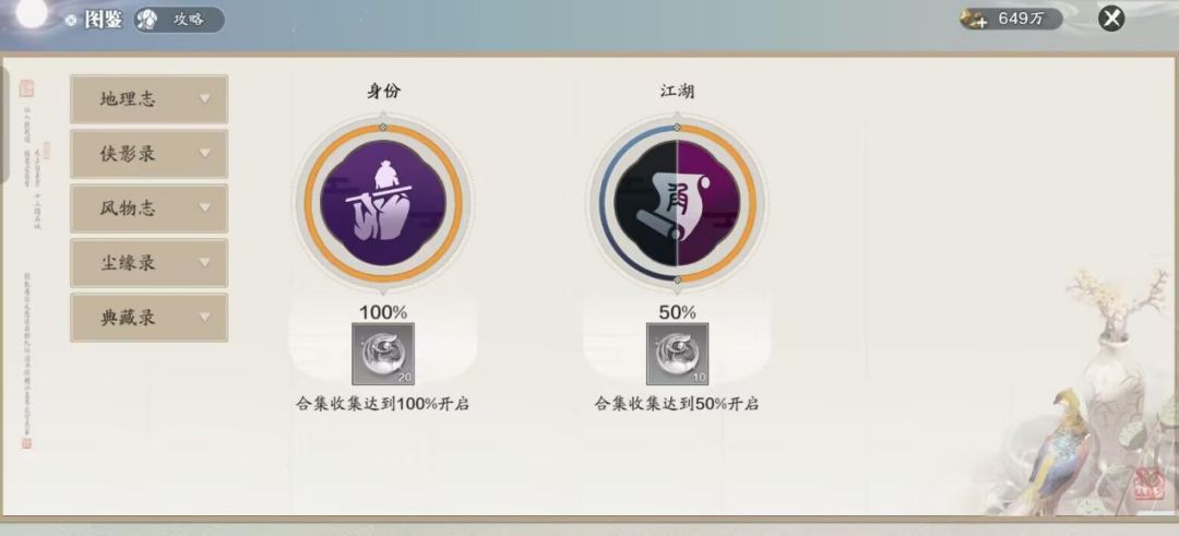 图鉴完成奖励:地理志、侠影录、风物志、尘缘录、典藏录等图鉴解锁后,总计可获得 2300 左右的月灵石。