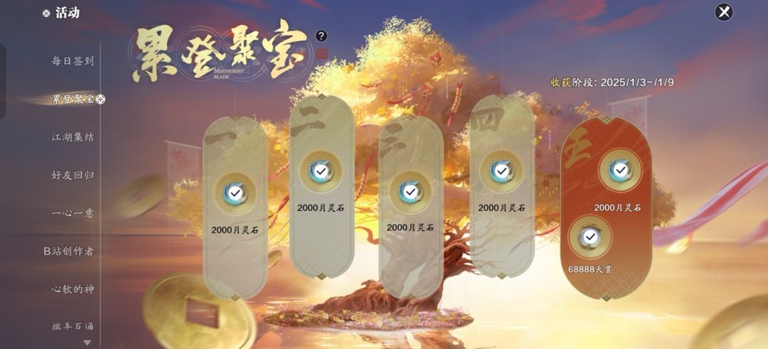 累登聚宝(只针对新开服):开服的累登聚宝活动可获得大量月灵石,通常可达 10000 月灵石,单服参与的少侠越多,奖池内可瓜分的月灵石数量越多。