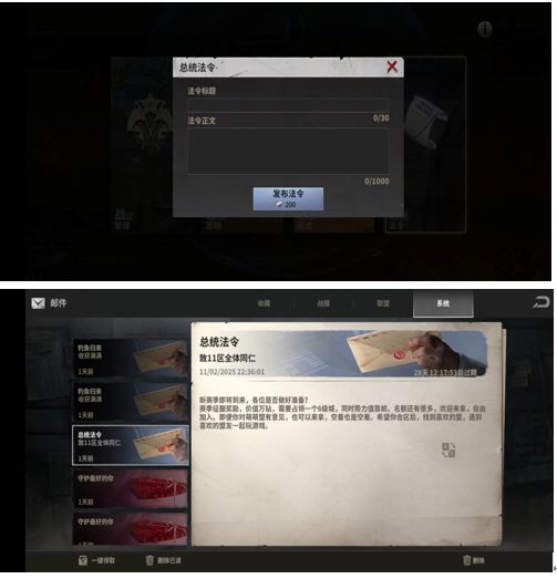 5.总统有权限发全区邮件,12小时冷却时间,200钻一次,每个玩家能在系统邮件中看到消息。