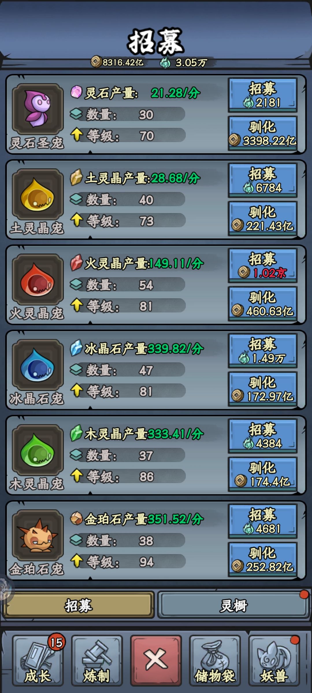 前期用铜币招募,后期一只灵宠就需要好几京,只能用幼灵招募。前期平均升级,到后期建议主升木冰火土四种灵宠,因为这四种后期缺口最大且最难采完。