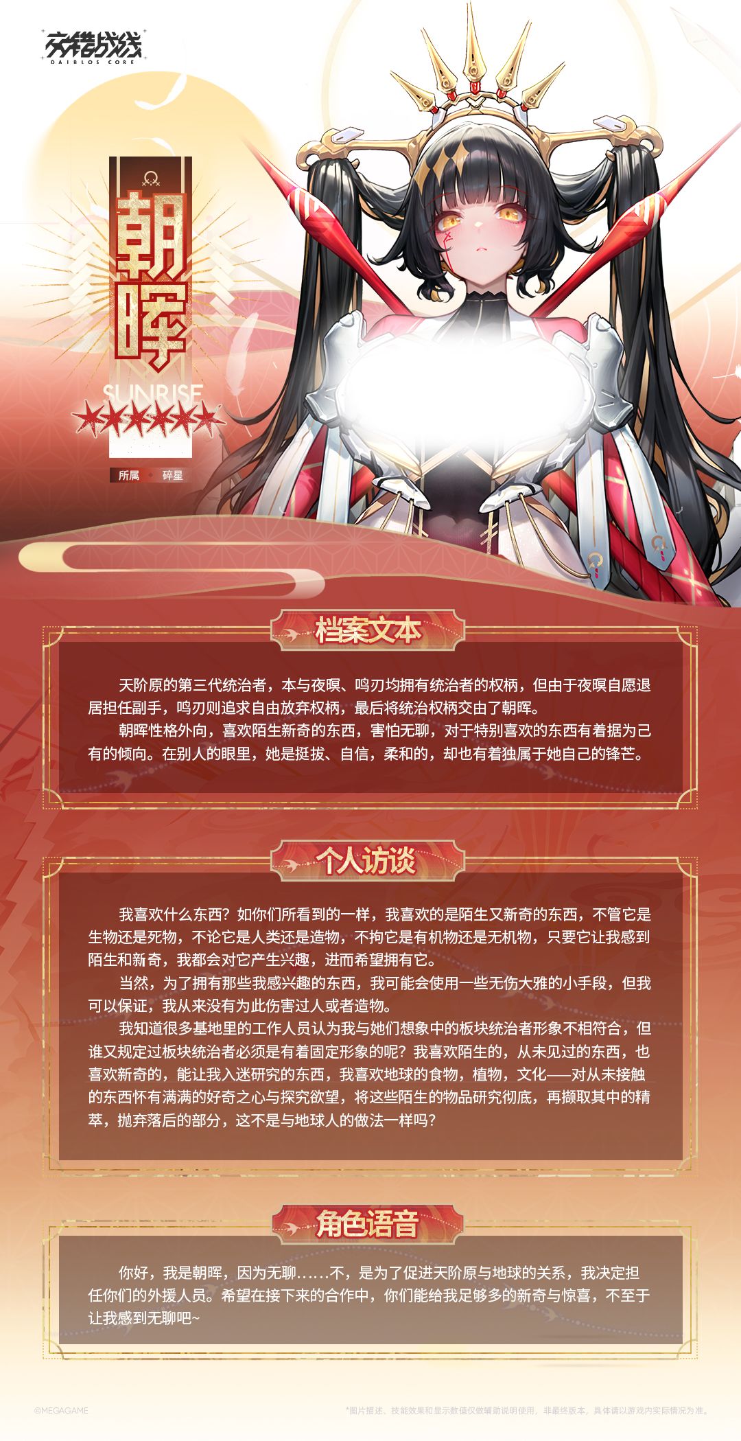“你好,我是朝晖,因为无聊……不,是为了促进天阶原与地球的关系,我决定担任你们的外援人员。希望在接下来的合作中,你们能给我足够多的新奇与惊喜,不至于让我感到无聊吧~!”