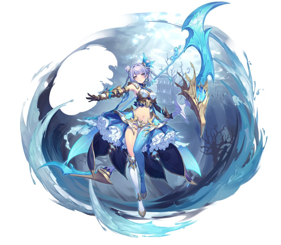 阿库娅使用剑、锚、弓作为武器,三种武器分别提供不同的加成效果。神盾使羁绊令她在拥有护盾时提高伤害和伤害减免,冰冷血脉更是可以让她增加对霜寒和冻结目标的伤害。