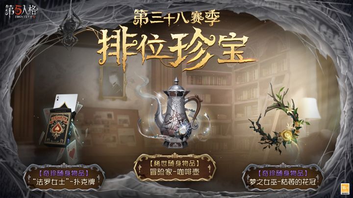【第三十八赛季·排位珍宝】内含【稀世随身物品】冒险家-咖啡壶、【奇珍随身物品】“法罗女士”-扑克牌与【奇珍随身物品】梦之女巫-枯萎的花冠。