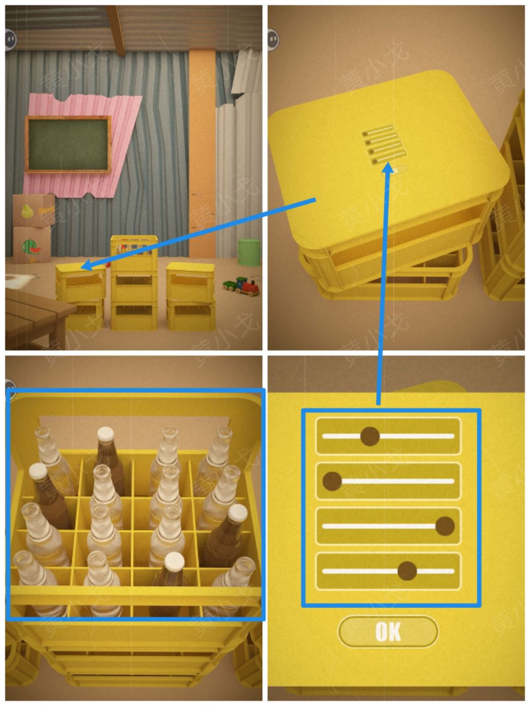 33.点击左侧的啤酒筐,根据中间啤酒筐瓶盖的位置线索,调整密码锁