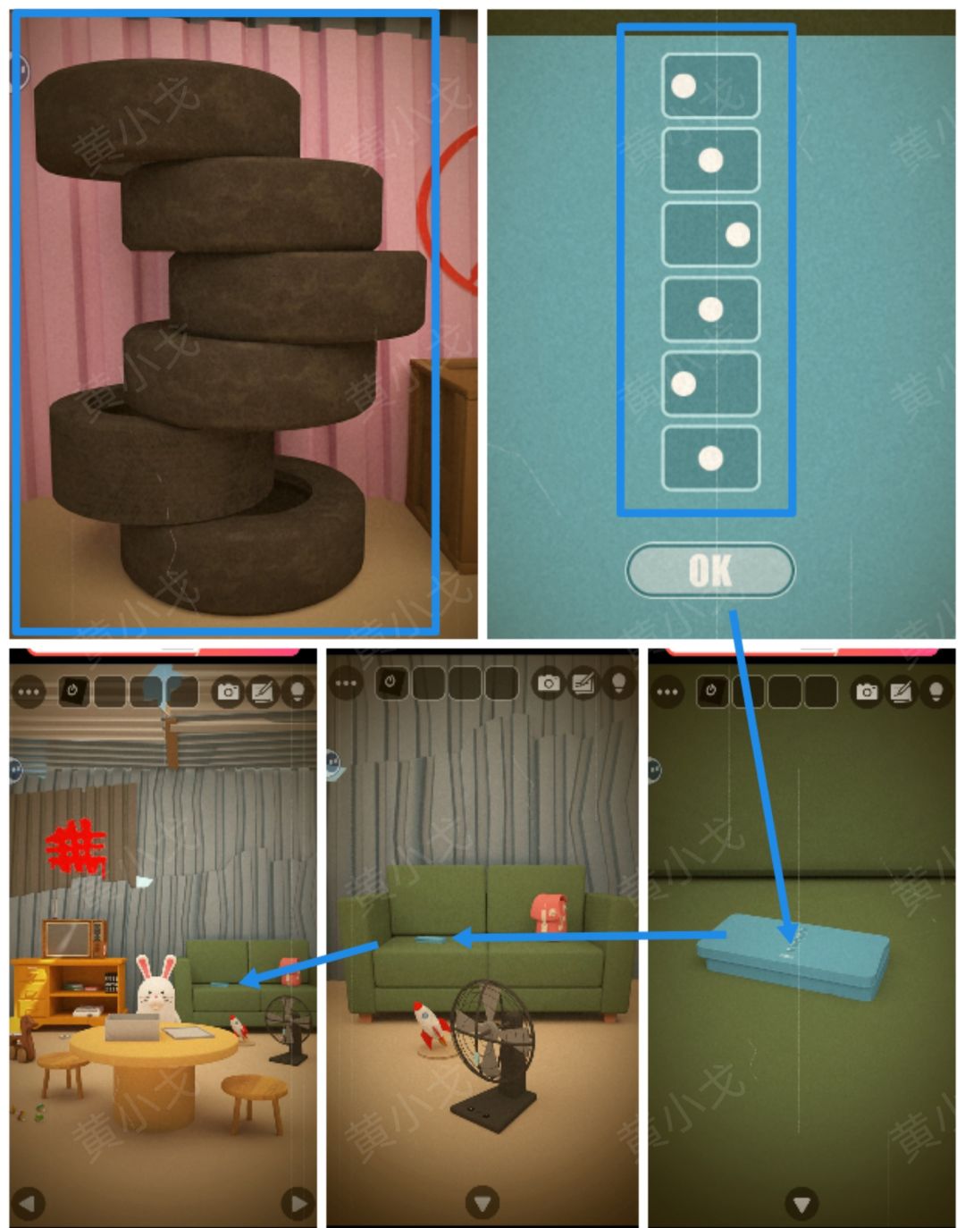 27.点击沙发上的文具盒,根据[门]场景轮胎位置线索,调整密码锁
