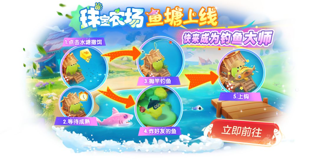 -炸鱼:好友总钓大鱼眼馋?那就化身深海爆破手,来一场炸鱼行动!潜入他人农场去炸鱼!球宝每日限定1次机会,有概率抢走他鱼塘中的传说鱼带回自己鱼篓!不过炸完记得快跑,毕竟农场主的鱼叉可不是吃素的~