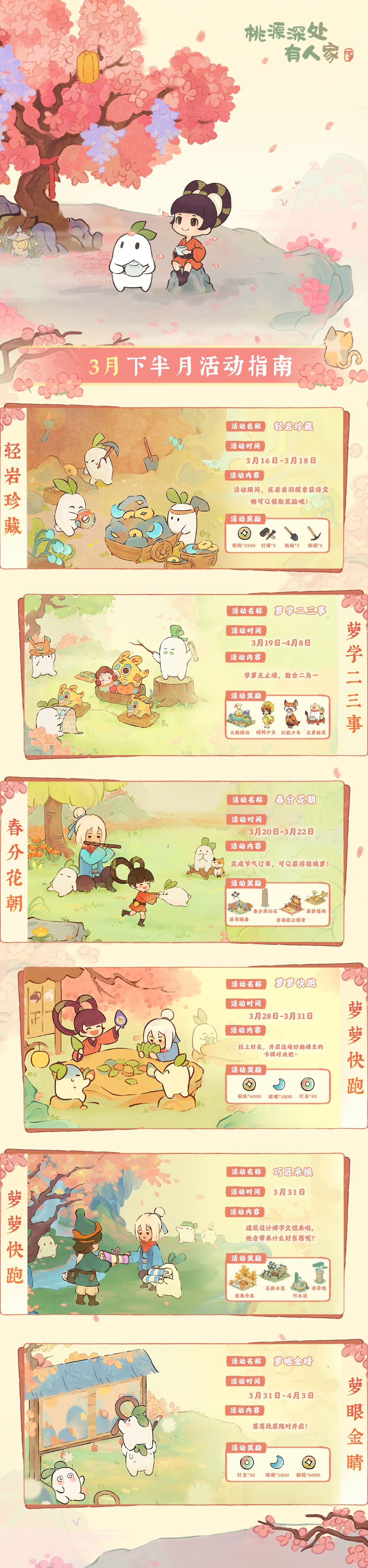 各位山民好呀!阳春三月,繁花似锦,桃源二周年庆典也在如火如荼的展开中萝!为避免山民参与庆典活动时错过常驻活动,小萝卜特意制作了三月下半月活动日历。山民们可以收藏日历防止错过活动时间萝!