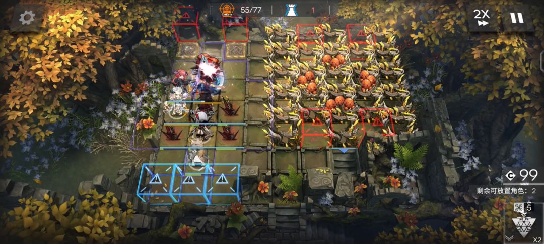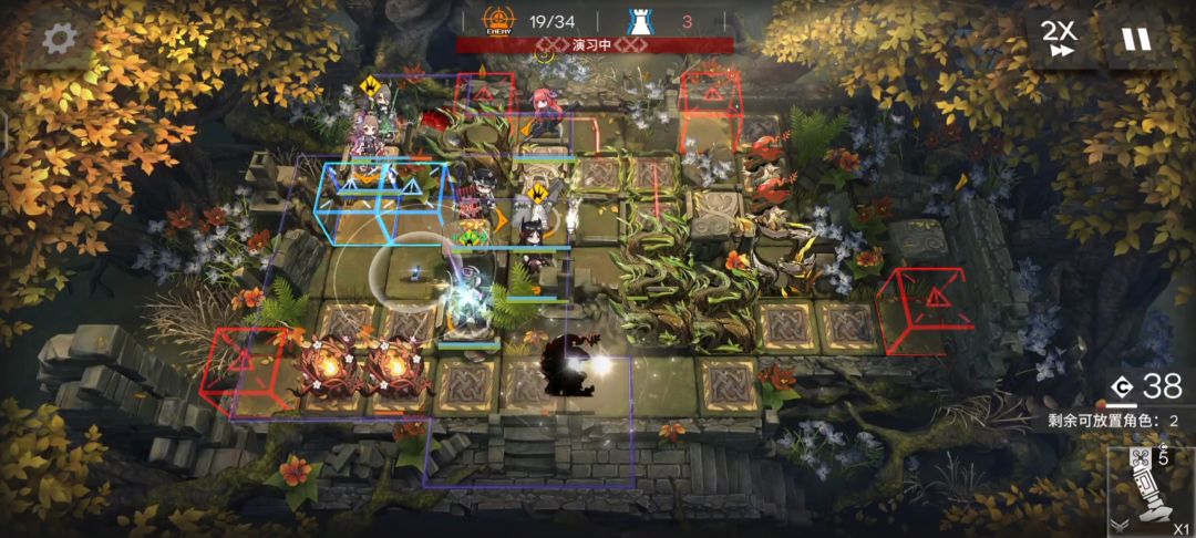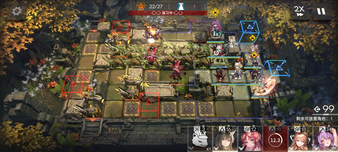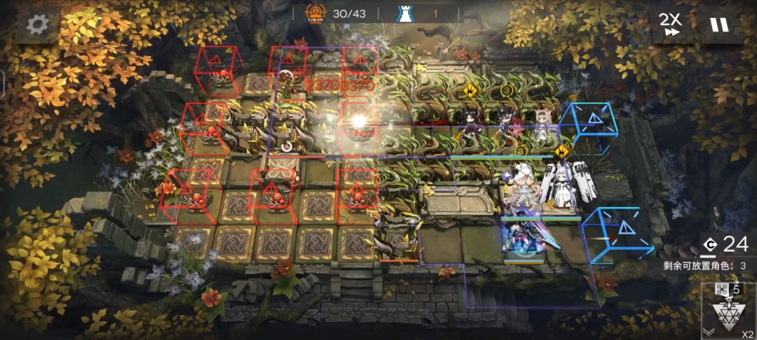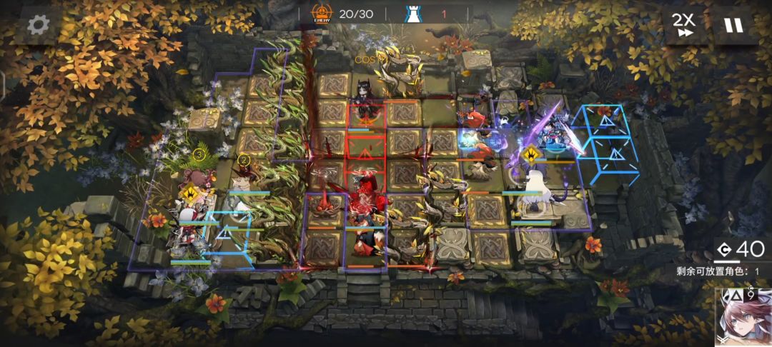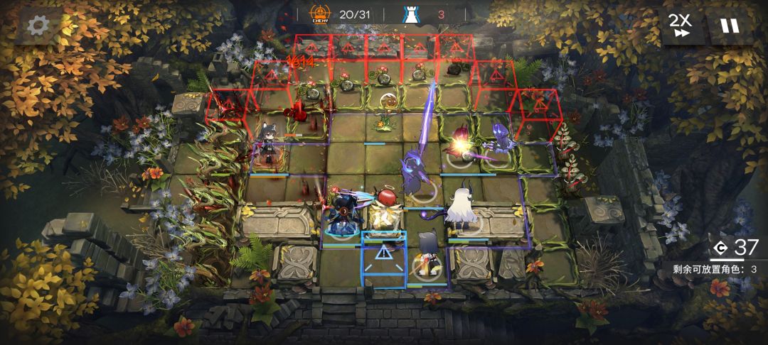 本关为八人作战,开局先下伊内丝回费,在蓝门前两格下山,撤掉伊内丝,再摆出图2阵容,其中除了阿能朝下,其他全部朝右,摆完就可以挂机了。