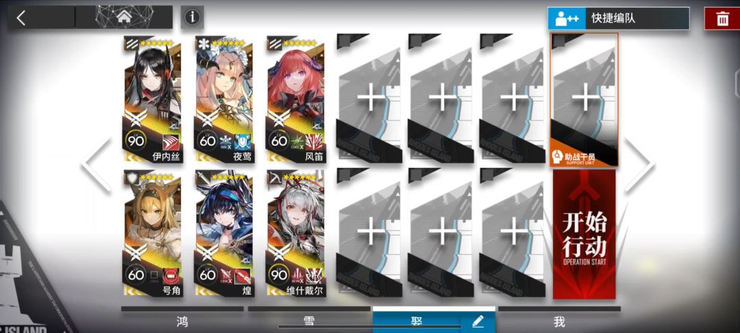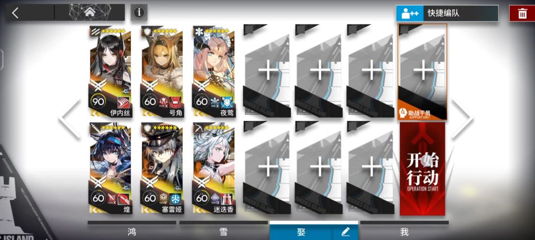 本关为六人作战,开局伊内丝回费,最下面摆煌其他干员先后随意,方向全部朝左,最后一波需要迷迭香开技能收割。