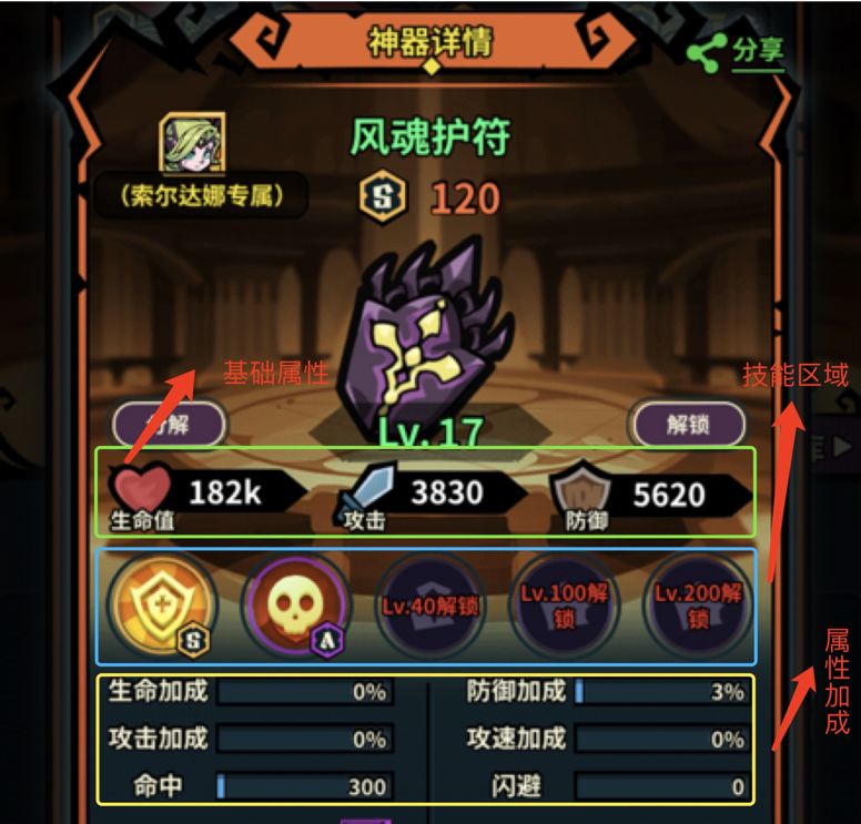 - 普通神器最多拥有两个技能,基础属性:生命 30.7k、攻击 370、防御 460.