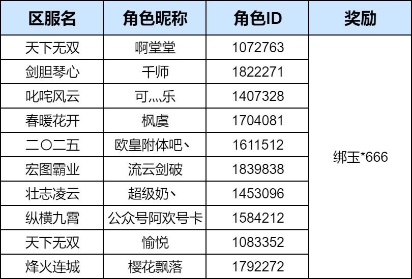 6. 活动期间到奖励发放完毕前,请不要更改角色名或区服,避免奖励发放失败。