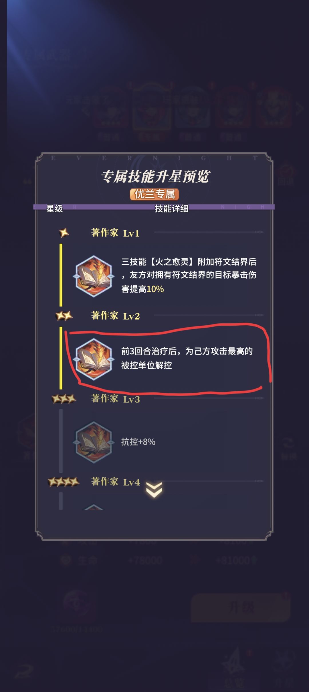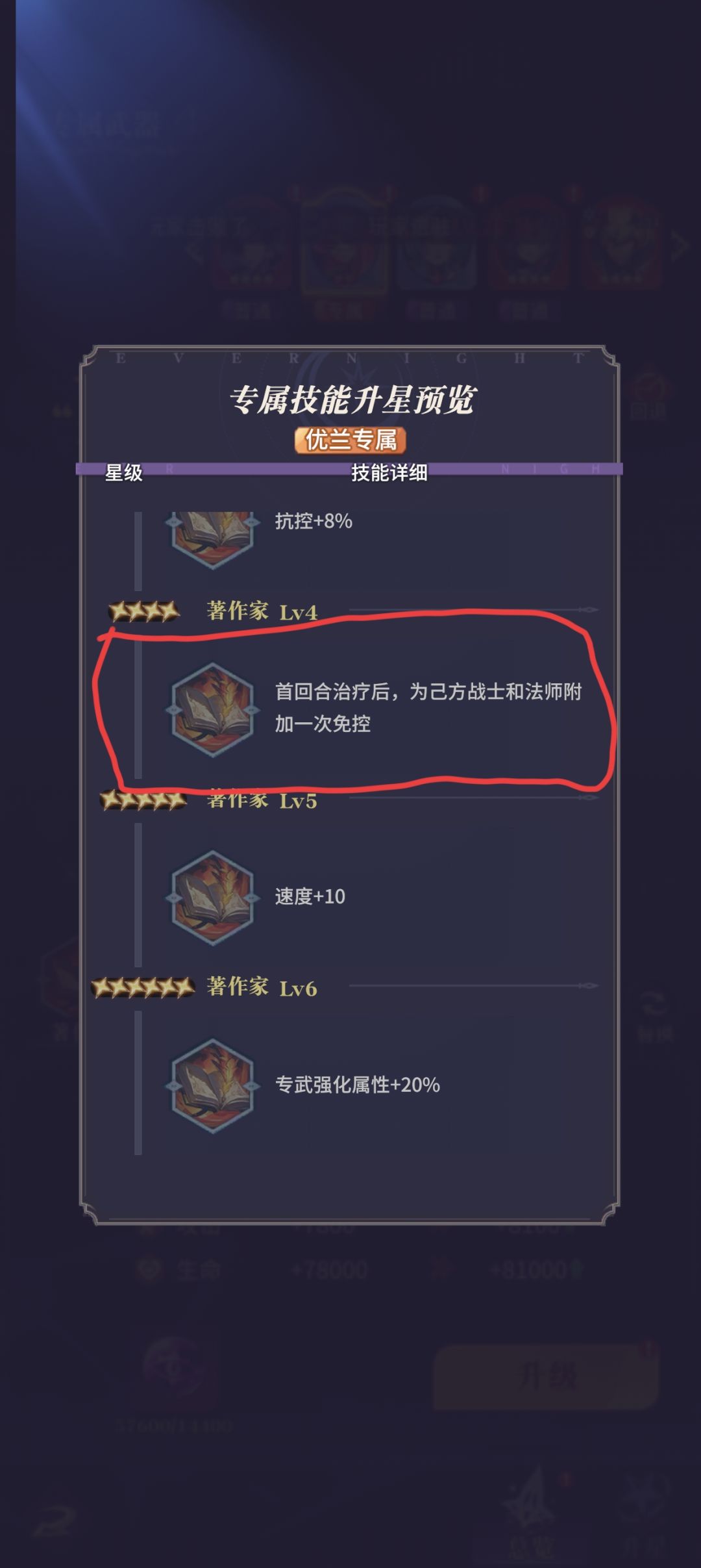 细致的玩家会发现,辅助的速度都是快于主C的,会导致优兰第一回合空加血,无法解控,只能作用于第二阶段解第一阶段控制,但四星专武就完美解决了这个问题 第一回合空加血,但是会给主C一个免控buff,完美解决千万回合控制问题。