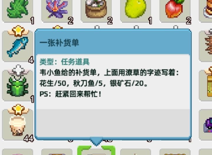 清单是做任务的时候看的任务栏,没注意包里有道具,做完后才发现的。瓶子是小桃的,比较奇怪的是小桃那个我已经做完了然后又拿到一个,现在谁都给了一遍送不出去了。现在都处理不掉了。有一点烦,没有销毁,也卖不掉
