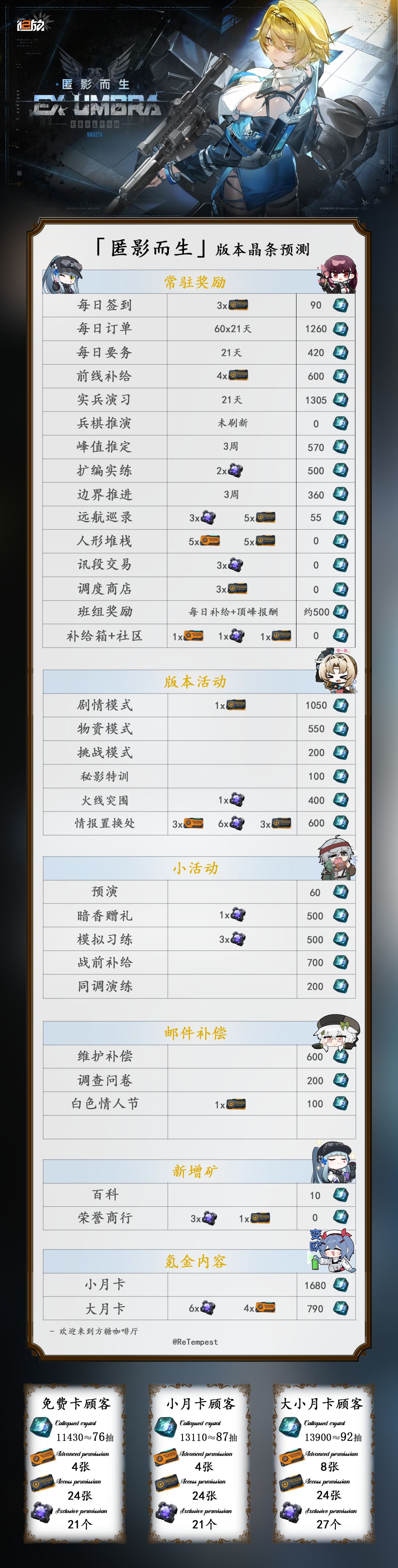 观众老爷们大家好,欢迎收看本次妮基塔版本的福利统计,这里是ReTempest。在妮基塔版本的21天里,零氪指挥官们可以获得共计104抽的抽卡资源,其中包含坍塌晶条11430+8张专票共计80抽,普票可以获得24张,紫核则为21个。对比上一个幼熙版本的91抽,略有回落。但是平均下来每天也能送3.8抽,福利也是一如既往的不错。