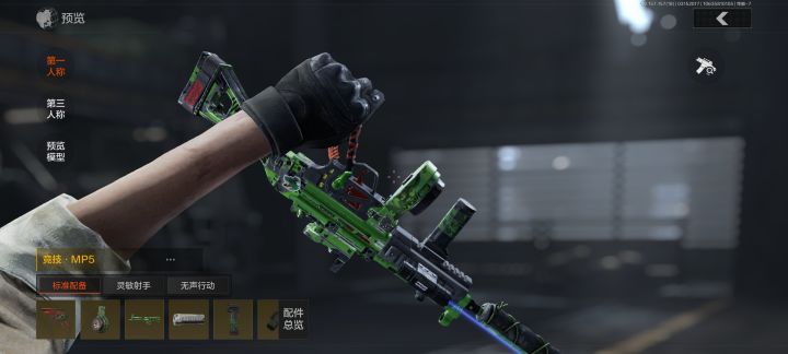 竞技MP5,这款皮肤给我一种枪轻轻的感觉,特别是检视时提起后握把,这把枪我打满分