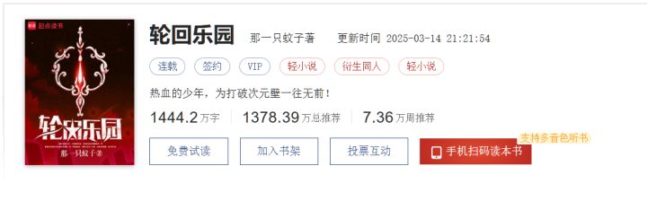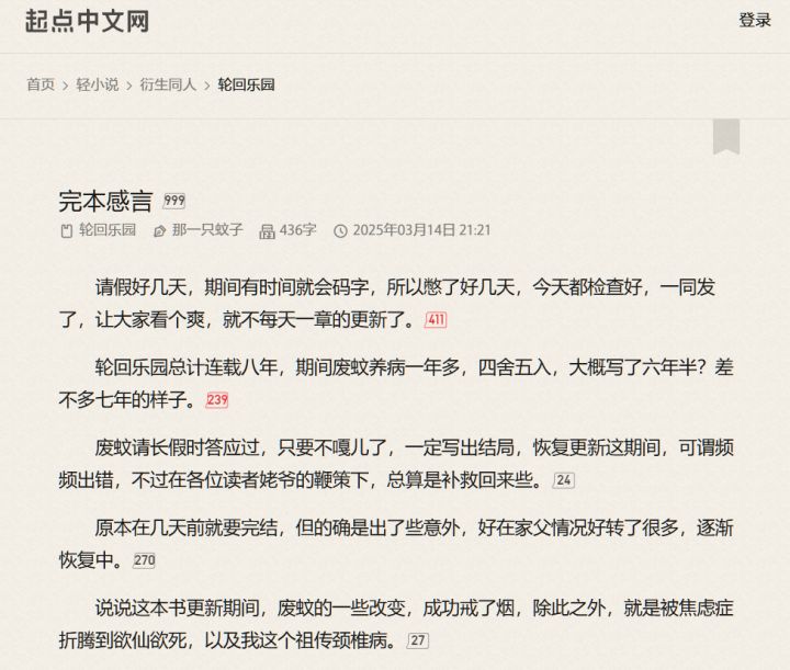 昨日,起点大神作者那一只蚊子连载八年,一千四百万字的无限流小说《轮回乐园》迎来了完结。此前作者因为身体原因暂时停更了很长一段时间,之后又恢复更新。