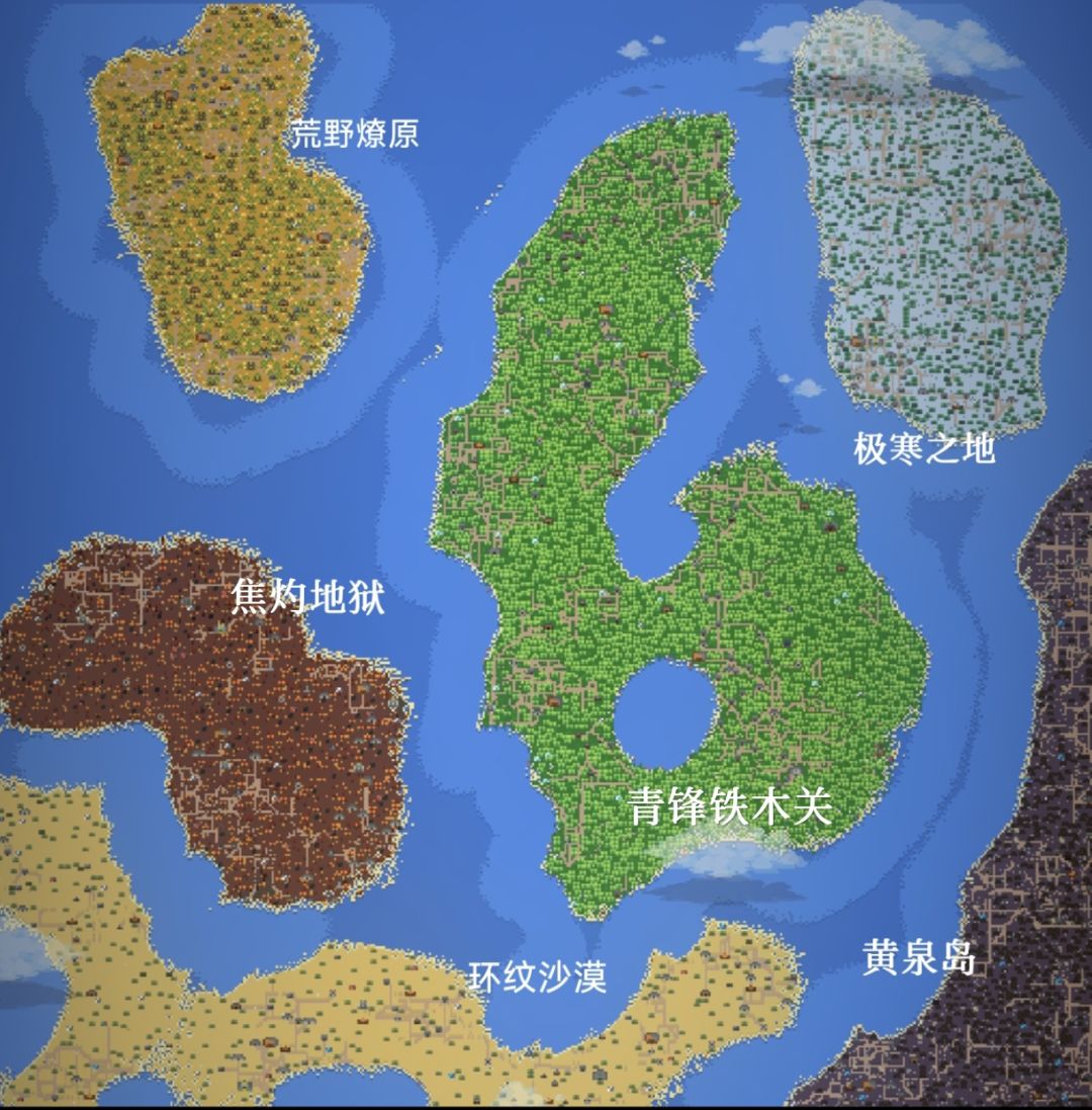 1. **青锋铁木关**:位于这片大陆的心脏地带,象征着世界的中心。外形酷似手持兵戈低首的战士形象,其地貌特征与丛林环境融为一体,仿佛是自然与人文完美结合的象征,守护四方平安。