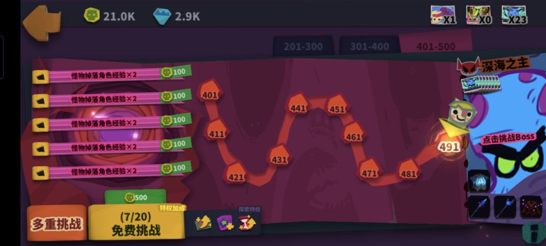 推401到500的时候,由于咱们已经专精满级了,所以经验对我们来说已经没用了,这时候就看自己选择了,你可以选择不用多重,直接打到500,也可以选择继续使用十倍多重挑战,不过祝福全部选择装备,这样500层结算的时候就可以获得大量的装备奖励,可以分解成大量的合金,还有大量的boss线索,可以用来挑战500守关boss-深海之主,深海之主掉落满级紫装。