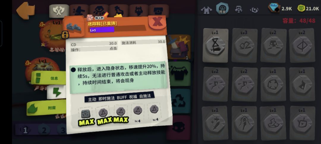 如果运气好,在随机商店刷新出来迷踪鞋,就做出来用,符文全部带buff持续时间提高,因为前期,肯定做不到无限隐身,也升不了太高的符文等级,全部带buff持续时间提高,打boss的时候开一下,打桩就好。