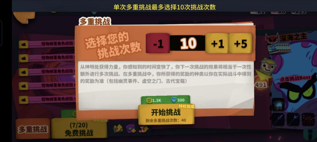 顾名思义,就是挑战一次可以获得多倍收益,最高十倍,配合五条经验祝福,打一次就可以获得十倍的经验奖励。