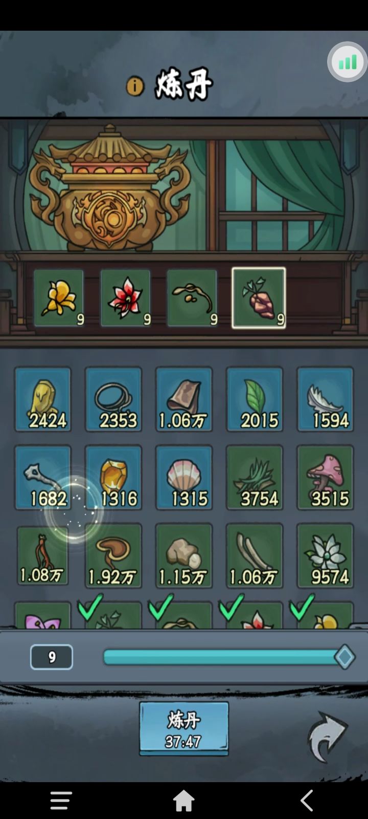 游戏炼丹是随机出丹,但是这样炼出修炼丹的几率更高一些,感谢好鸭大佬的分享:选择最后四个草药各9,也可加9草药和9蘑菇增加丹量(这两个不影响种类只增加丹量)。