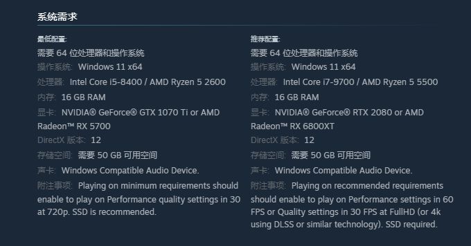 最低配置GTX 1070Ti,推荐配置RTX 2080显卡。硬盘方面需要50GB硬盘空间,推荐使用SSD,且必须运行Windows 11