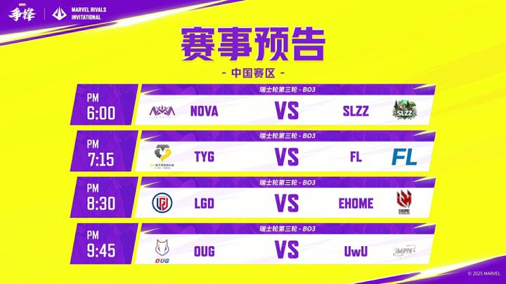 小组赛瑞士轮第二天精彩纷呈,各支战队祭出秘密战术,争取更好的双败淘汰赛排名; 首场比赛TYG战队在轻取一局的情况下,立刻迎来NOVA战队调整阵容后的反击,最后鏖战三局2:1险胜,抢占胜者组先机; 第二场比赛如出一辙的是,FL战队在拿下首局的情况下,SLZZ战队果断更换六个英雄给FL战队迎面一击,最后经验丰富的FL战队稳住状态,2:1险胜获得小组赛首胜! 第三场比赛LGD战队掏出S1赛季新英雄霹雳火,率先拿下一局,OUG战队在MVP选手沫蓝的带领下逆转战局,最终OUG 战队2:1险胜LGD战队! 第四场比赛MRC冠军战队UwU战队2:0轻取首日发挥优异的EHOME,到底谁能给状态火热的UwU战队带来威胁,让我们拭目以待! 今天将是MRI中国赛区小组赛最后一轮,夺冠热门UwU与OUG强强对决抢占第一顺位,TYG、FL、LGD、EHOME战队谁能卡位胜者组,18:00准时锁定《漫威争锋》官方直播间 ,让我们一起见证MRI中国赛区精彩对决! #漫威 #漫威争锋 #漫威争锋第1赛季 #漫威争锋邀请赛中国赛区
