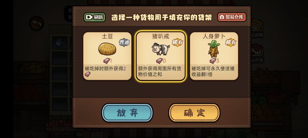 了解玩这些,那么卡牌类型以及选卡思路大概也很清楚了,前期尽量选泛用性比较强等金卡,没金卡就选泛用性比较强等蓝卡,或者是蔬菜类的白卡,因为蔬菜类的卡后面你不想要了,可以喂猪慢慢消掉;