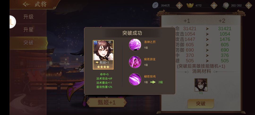 都知道,这个游戏的将领技能升级突破时是随机提升3个技能中的一个(满级6级)。那如果升级的技能不是自己想优先提升的话怎么办,下面的方法可以助你刷出自己想要的技能等级。。 。首先把要刷技能的将领卡牌(在将领属性界面)通过置换功能置换成4☆卡(这点很重要!重要!重要!不然会把4☆升到5☆或者6☆的材料直接被系统吞了找不回的),然后用同名+0卡在突破界面吞掉+1以上的同名卡(例如上图的甄姬+0突破时把+6甄姬卡吞了)技能会重新刷新、卡牌也会退还。重复操作直到刷出自己想要的技能等级。