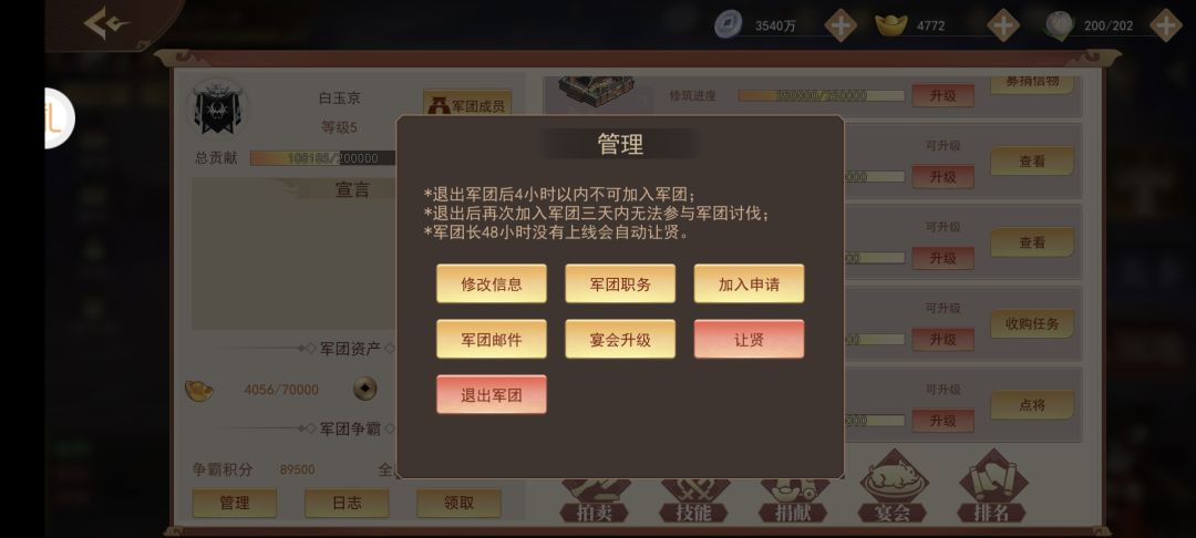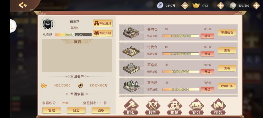 宴会:升到4级,需要军团4级(体力奖励20变成40,信物✘1变成2,豪杰情缘信物2个变3个,豪杰的情缘信物需求是很多的)