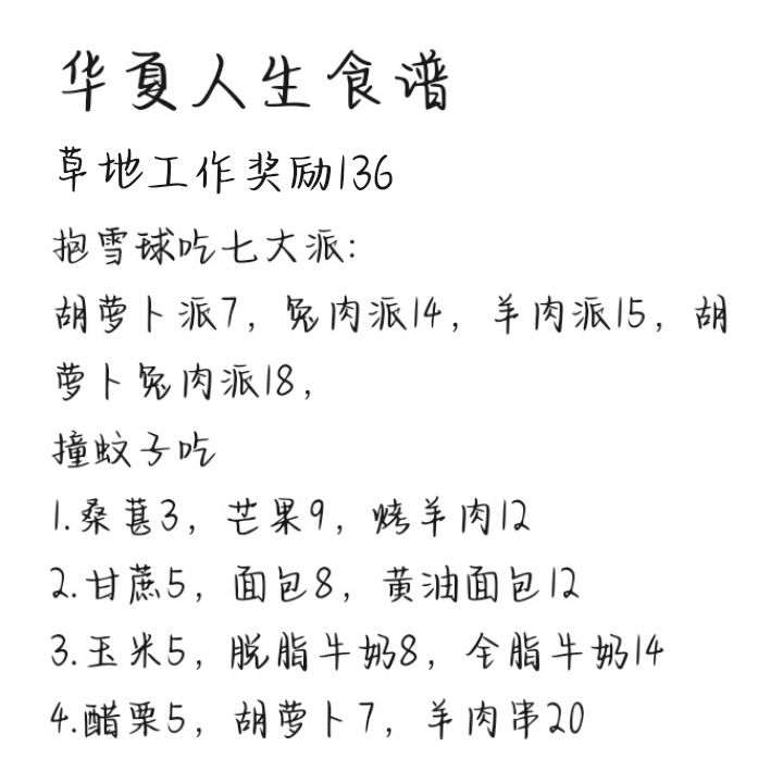 本人总结的食谱,新人叠食可以看一下,最后奖励136,在草地工作或者挂机完全足够