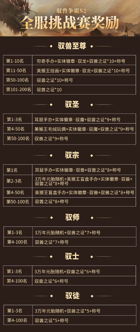 驭兽争霸全服挑战赛规则公布后,我们关注到旅者们在各个社区中的反馈,考虑到驭兽至尊段位高手云集、竞争尤为激烈,我们决定对驭兽至尊段位的排名奖励增加更多名额: