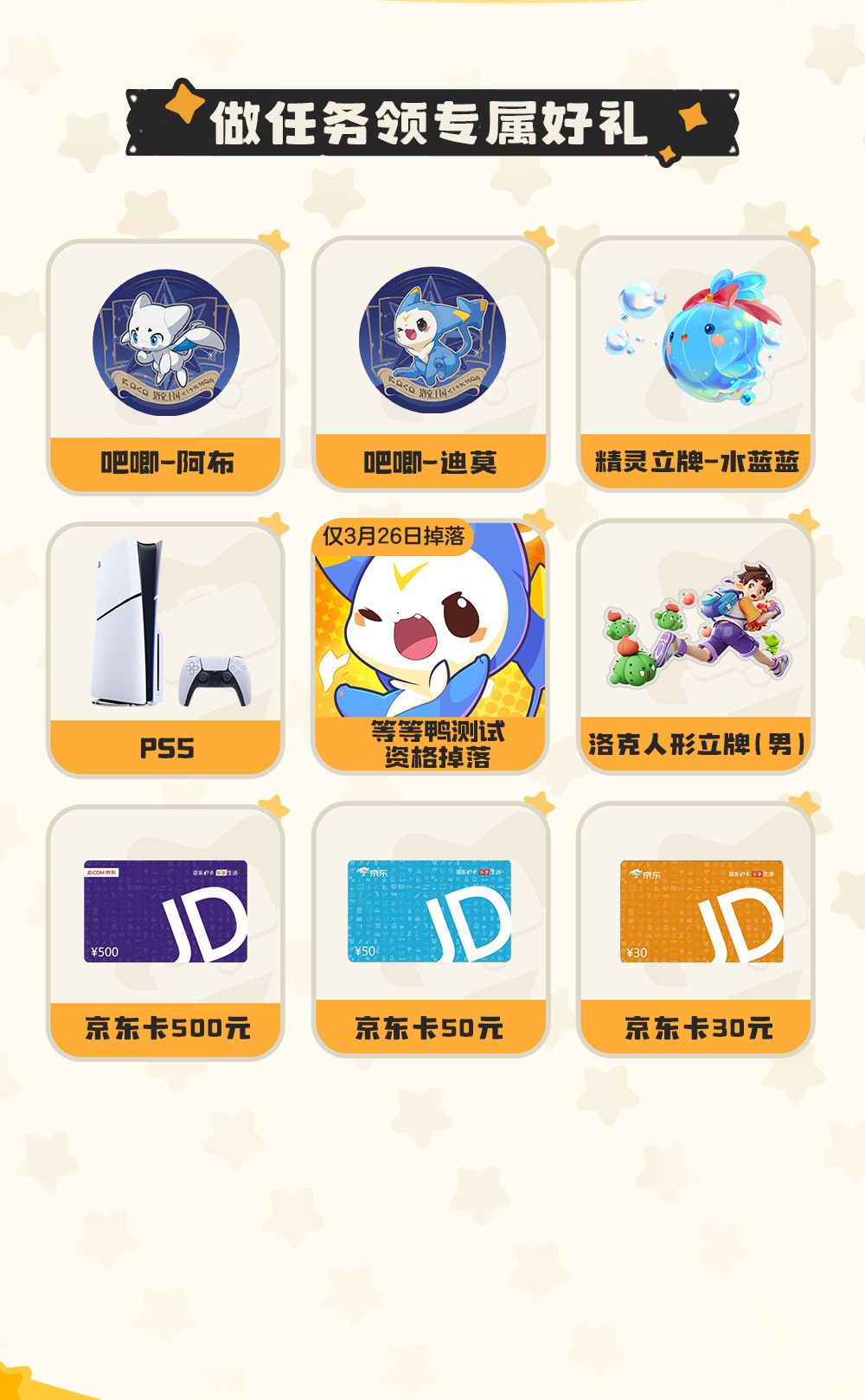 抽奖有机会获得PS5、精美周边、京东卡等海量福利!3月26日当天,更有机会掉落「等等鸭测试」的专属资格!