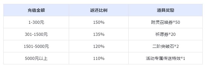 1、充值金额在1-300元的部分,将按照150%的比例进行代金券返还,并额外获得附灵券*50;例如:测试期间充值300元,可获得代金券返还金额为:300*150%=450元代金券,和附灵召唤券*50的道具奖励。