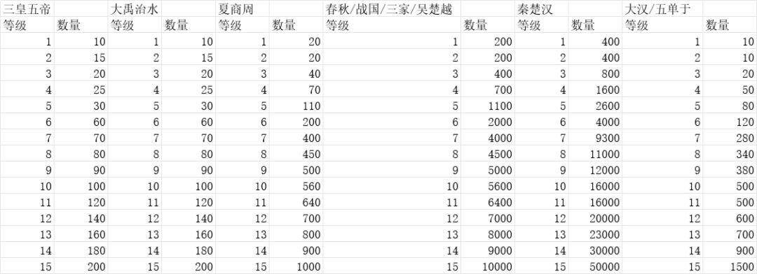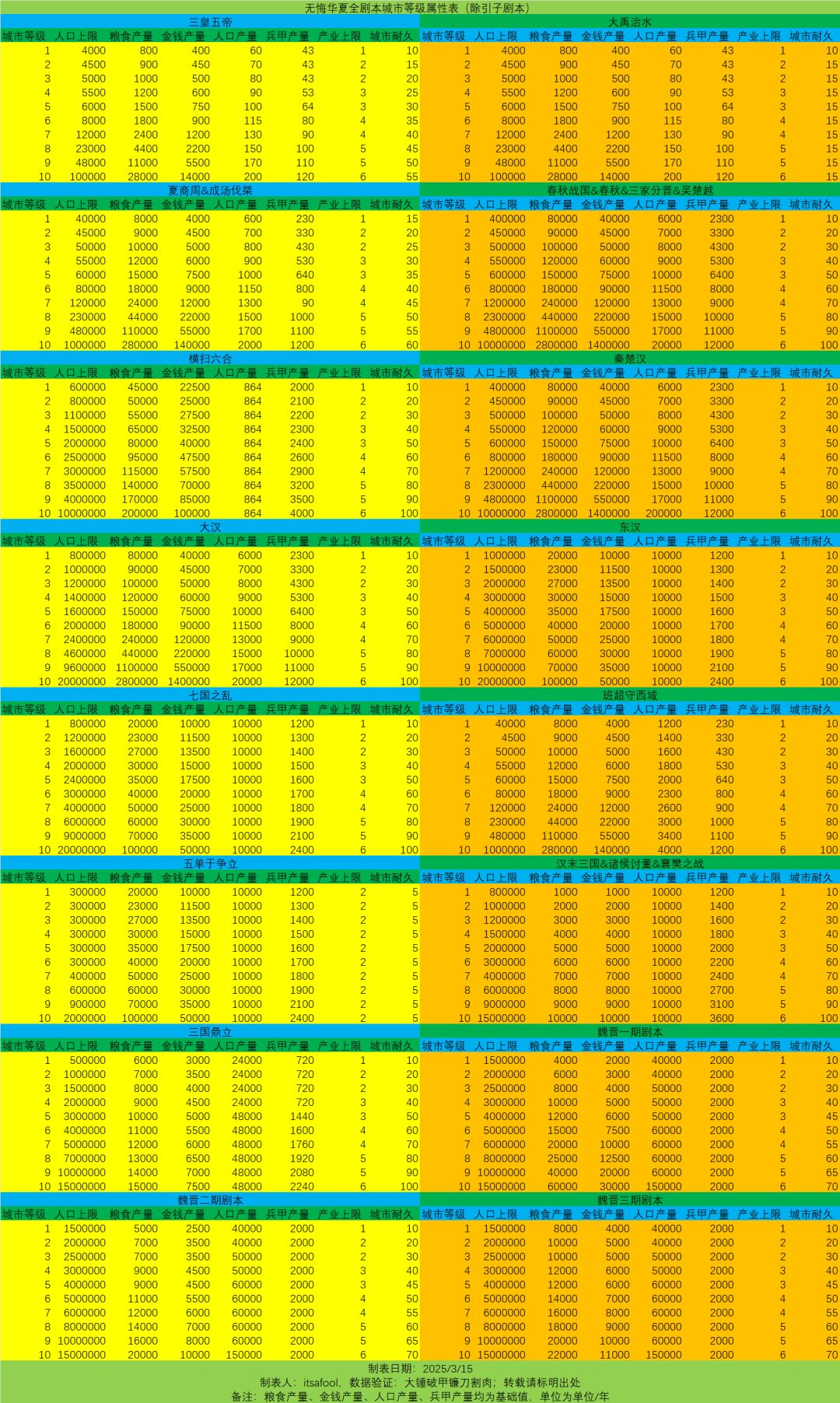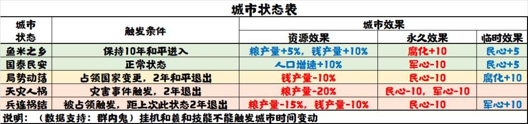 发展时间的基本逻辑是:全国范围内的所有城市都会每秒产生一定量的钱粮,国家产量等于所有城市产量之和。城市产量的来源有三种:城市基础产量、产业产量和城市buff。城市基础产量与剧本和城市等级有关,详见下图。