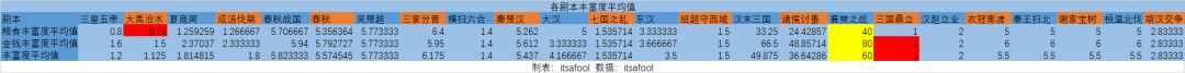 钱粮支出则主要由两部分组成:固定支出和动态支出。前者指维护兵甲、城市所需要的支出,后者指升级兵器、点出时代政策等行为所需要的钱粮。前者我们暂时略过。关于后者,我们可以引入两个概念:膨胀系数和丰富度。膨胀系数指:以三皇五帝为基准,以施行五星无装备督邮一政策所需的钱粮为例,测出在不同时代中钱粮膨胀了多少。膨胀系数越高,说明这个剧本的名臣政策钱粮消耗越多。丰富度是指:一个剧本中某个势力开局的钱粮能够施行多少次五星无装备督邮一政策。丰富度越高,说明剧本越不缺钱粮来施行名臣政策。数据见下图。钱粮支出也存在一个系数,这与腐化相关。每有一点腐化,单兵消耗+1%。也就是说,腐化翻倍时,固定支出是腐化为0时的两倍。