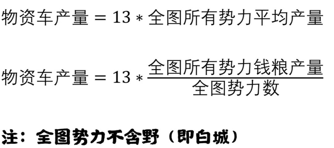 物资车是一个较为常用的量。毫不夸张地说,无悔中大多数的钱粮数值都或多或少地与物资车相关。在华夏中,使用一个物资车会获得1车的钱粮。有些政策会以车为单位提供钱粮,其中“车”这个单位就来自于物资车。物资车钱粮的计算公式如下。