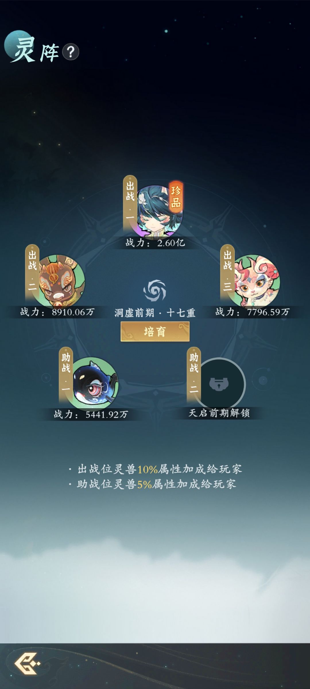 首先看灵阵培养,灵阵是布置宠物上阵和培养的功能玩法,我们需要用各种品质的御灵草升级灵阵,可以提升战力和上阵更多灵兽,是灵兽总体培养。需要注意的是,洞虚过后可以上阵灵兽助战而不出战,这里只推荐用鲸鱼助战(驴子和狗子的2、3技能实战过程中有用)。其他的需要一直白嫖材料升级就可以了,偶尔在化神灵界可购买一些御灵草快速解锁新灵兽格子。