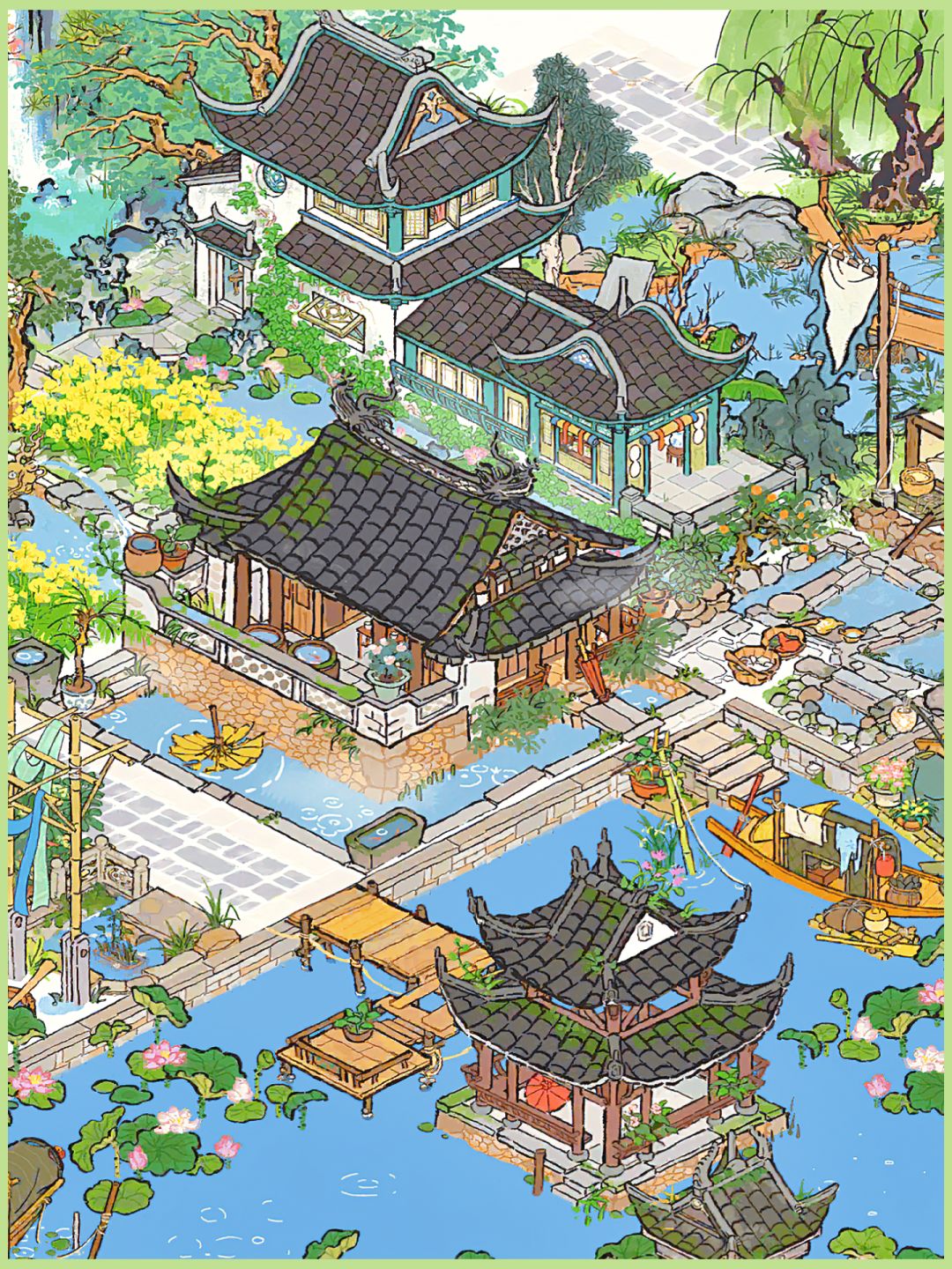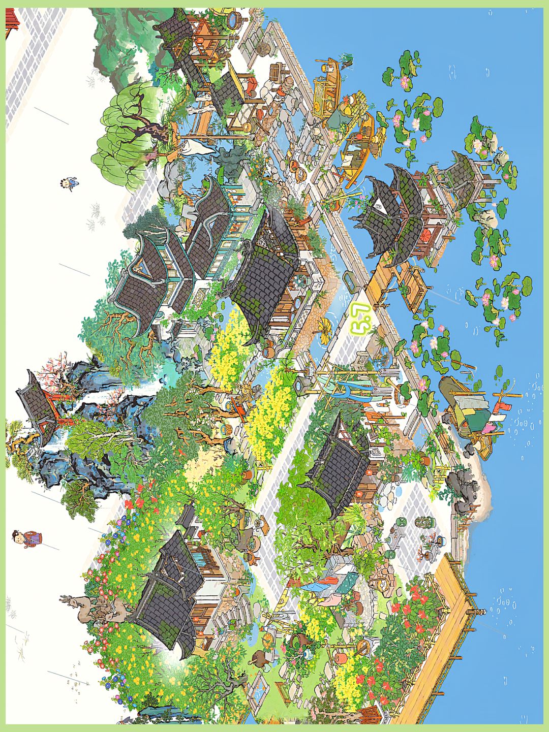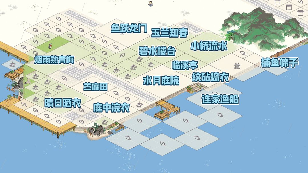 建筑:碧水楼台、临溪亭、树荫亭、鱼跃龙门、水月庭院、野舟横渡、小桥流水、纹砧捣衣、烟雨熟青梅、庭中浣衣
