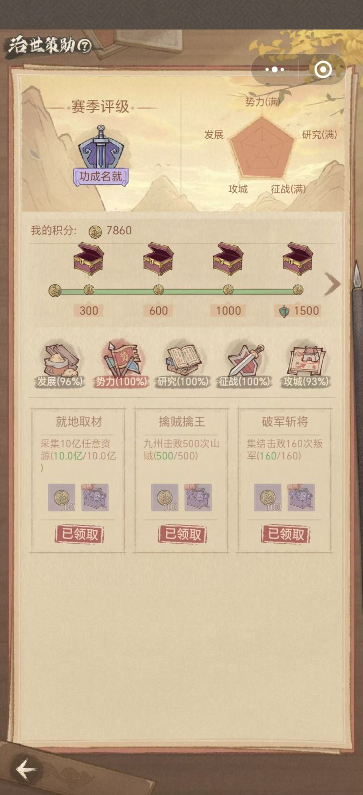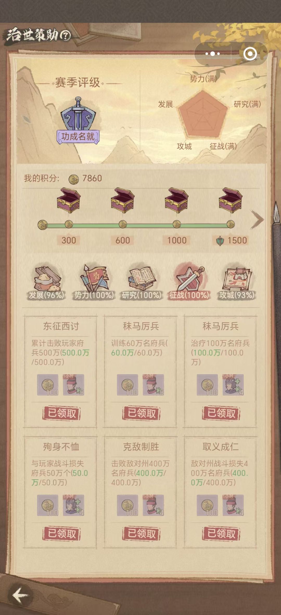 治世策勋是贯穿整个赛季的任务,奖励丰厚,但要完成它的难度比较高,我将按治世策勋的任务模块给大家一一分析: