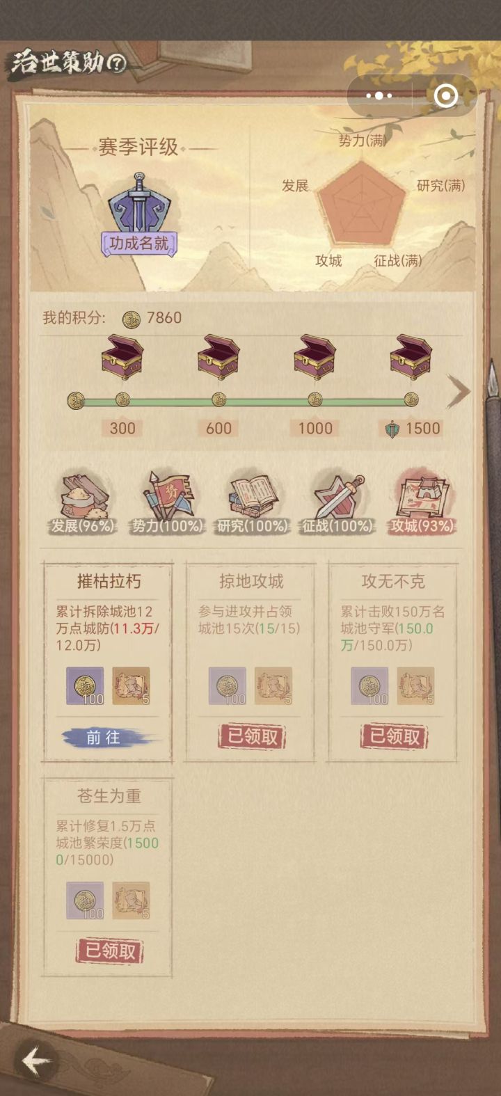 攻城篇中摧枯拉朽是最难完成的,需要在赛季中找机会去刷墙皮,如果攻城破坏值是500,牌子满是15块,就是刷光一次牌子拆除城墙值是7500,总共要拆除12万的城墙值,其中,还需要队友帮忙打掉守军,就这样满打满算,都要刷16次城墙,少年,时不待我,请抓紧时间刷城墙。其它小版块相对容易点完成,可以在向长安进军的过程中,顺便完成。