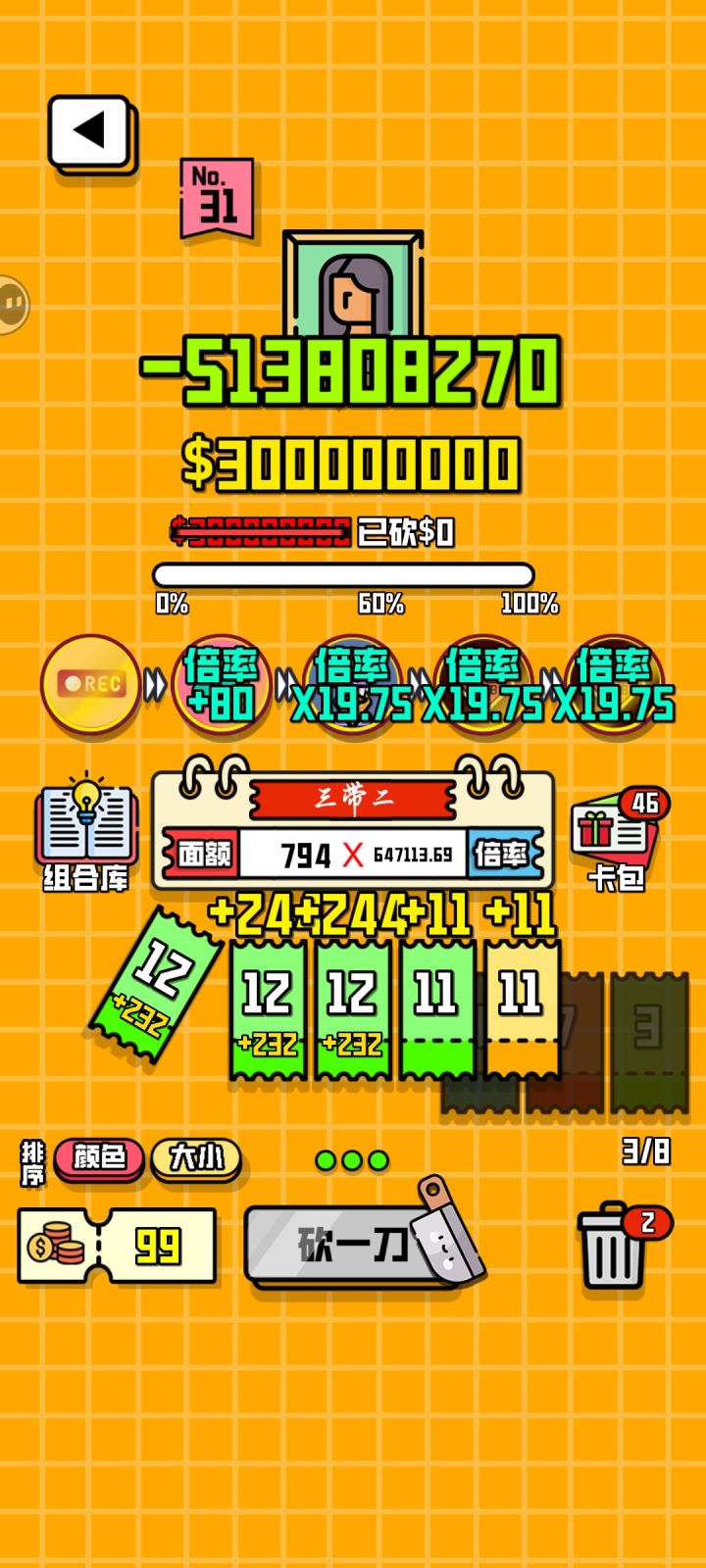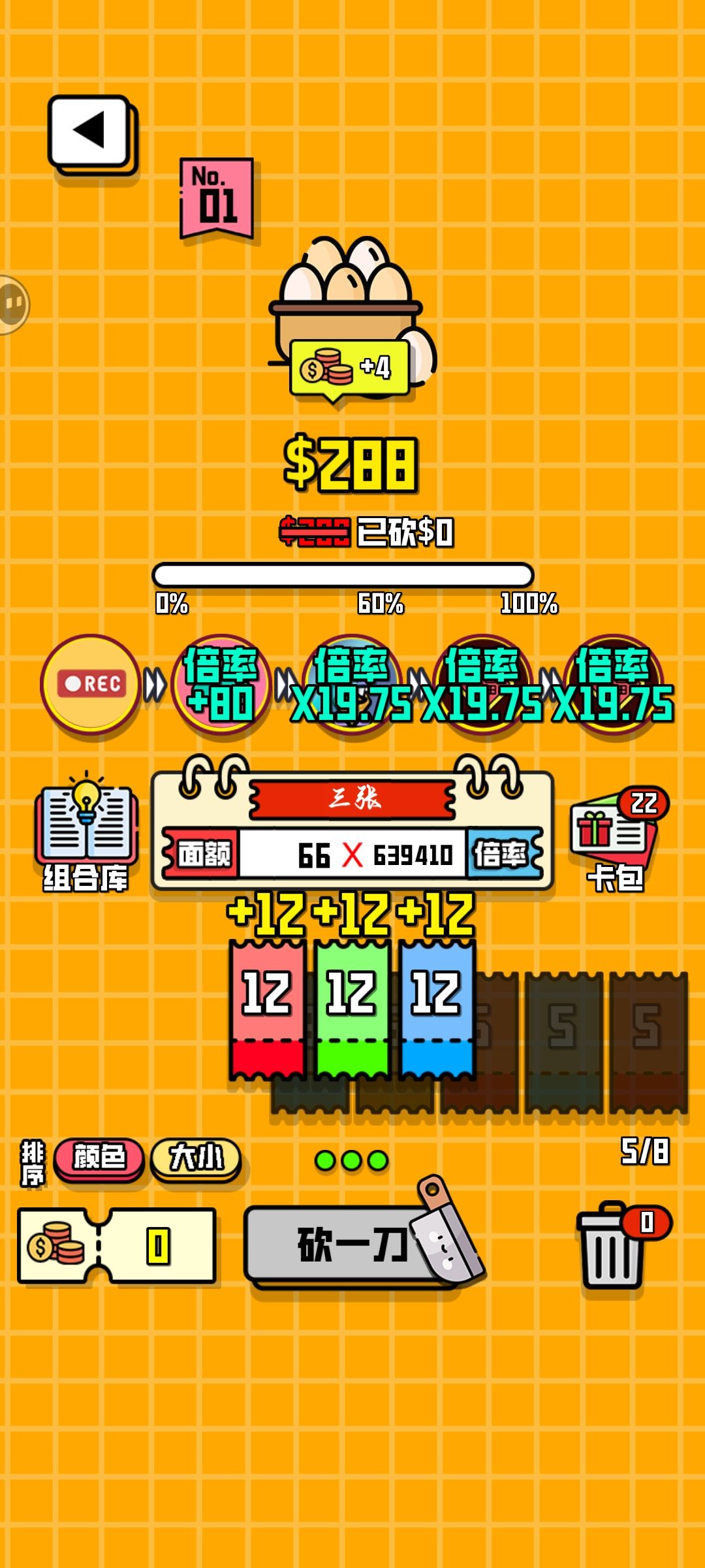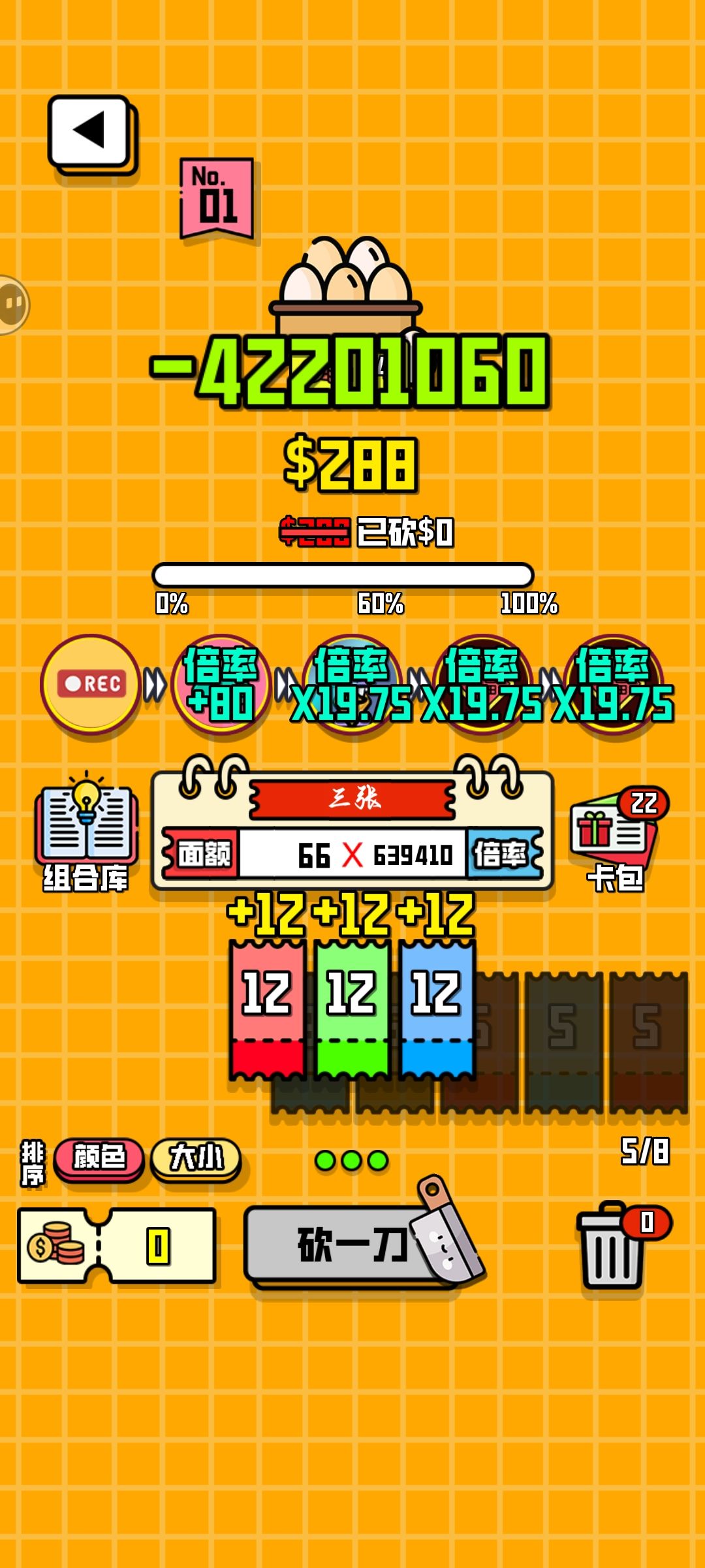 理论上这套搭配没有上线,前期越早获得福和复制还有录音机越好,当然这游戏有bug,退出后道具不会重置,大部分效果还在,所以就可以用这个bug来无限刷倍率,第一次只出一张可以复制当前使用的牌,只要一直刷一种颜色的12就行了,因为复制的12也会复制录音机的面值(录音机效果:使用的有效卡在本局游戏可以永久增加4面值),觉得倍率刷的差不多了可以把复制换成大法师(大法师效果:复制右侧道具的效果)