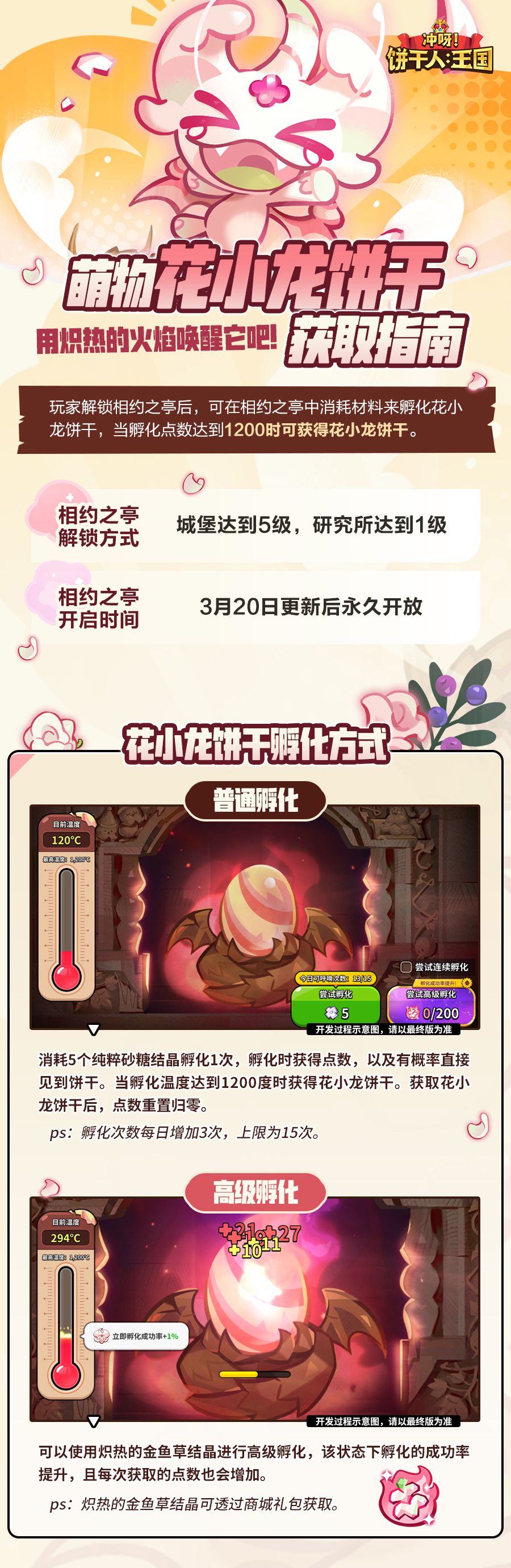 饼干朋友们城堡达到5级,研究所达到1级后即可解锁相约之亭,在相约之亭中可花费材料来孵化花小龙饼干,当孵化温度达到1200度时必定获得花小龙饼干,获取到花小龙饼干后孵化点数将会重置归零。