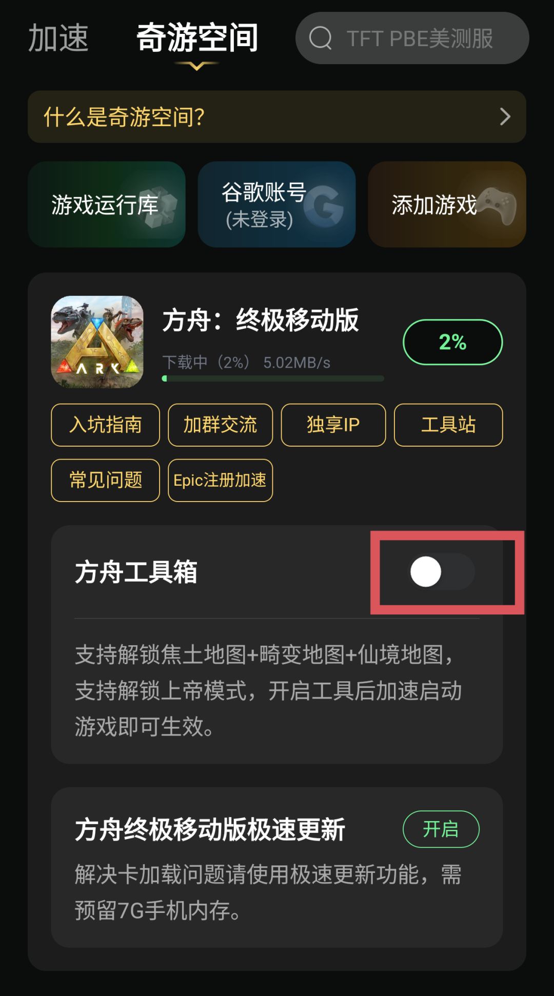 第三步:在奇游空间内,点击《方舟:终极移动版》下方工具箱。等待方舟安装完成后,点击【加速】启动游戏,即可体验游戏内容。